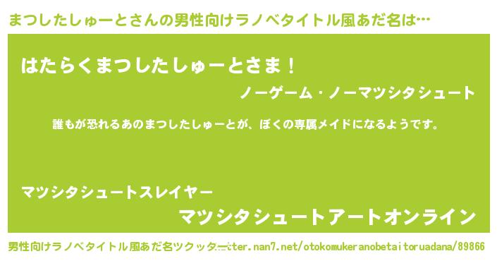 | 胡散臭い通販商品みたいなあだ名 | 『来世でも幸せになれる健康食品…その名も「まつしたしゅーと」』 |