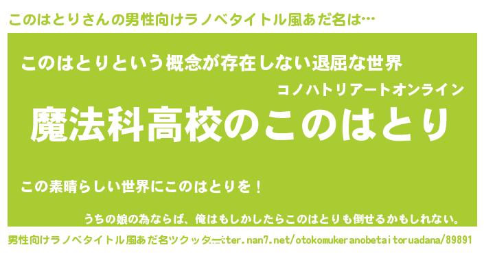 | 女子向けラノベタイトル風あだ名 | 『このはとりなんてお断りですっ。』 |