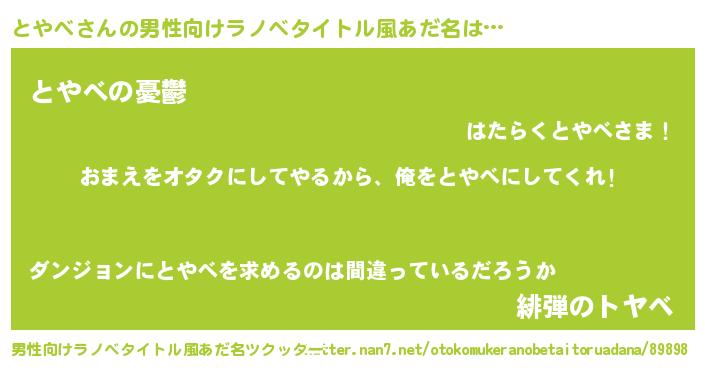 | 女子向けラノベタイトル風あだ名 | 『とやべ夫妻のなれそめ』 |