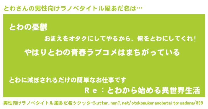 | 女子向けラノベタイトル風あだ名 | 『とわの雑貨屋さん』『闇のとわ』 |