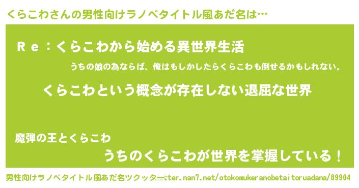 | 女子向けラノベタイトル風あだ名 | 『異世界で失敗しない100のくらこわ』 |