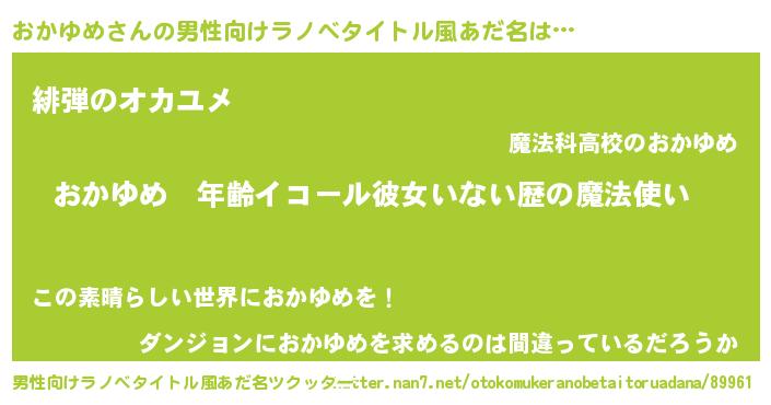 | 女子向けラノベタイトル風あだ名 | 『おかゆめの玉の輿計画!』 |
