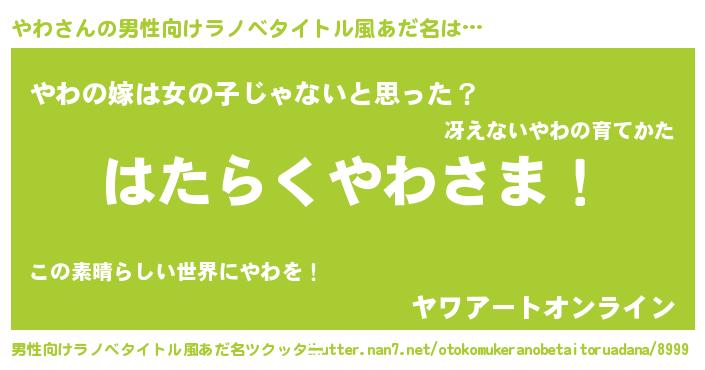 | 胡散臭い通販商品みたいなあだ名 | 『信頼と実績のサプリメント…その名も「やわ」』 |