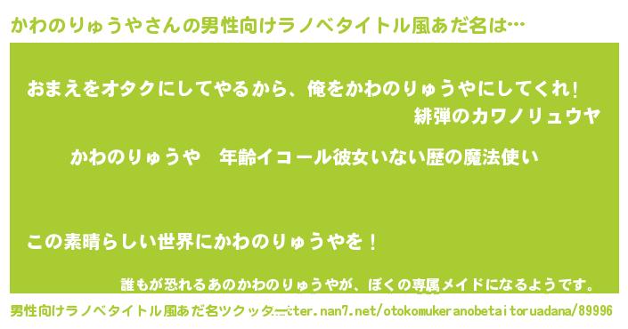 | 女子向けラノベタイトル風あだ名 | 『かわのりゅうやの玉の輿計画!』 |