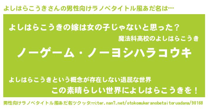 | 女子向けラノベタイトル風あだ名 | 『死神よしはらこうきの再婚』 |