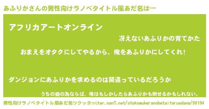 | 女子向けラノベタイトル風あだ名 | 『あふりか夫妻のなれそめ』 |