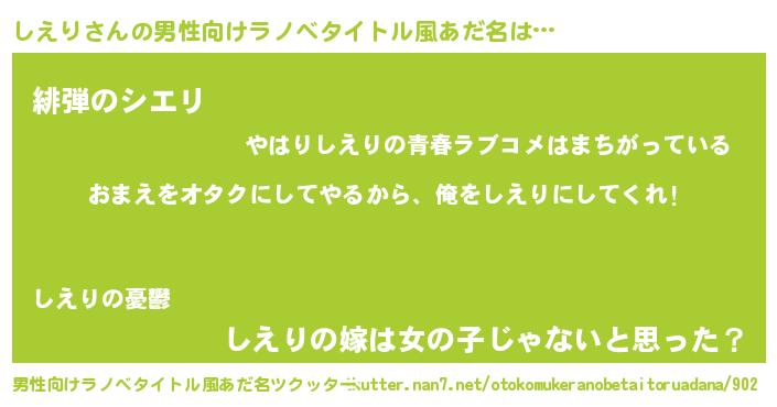 | 女子向けラノベタイトル風あだ名 | 『しえり夫妻のなれそめ』 |