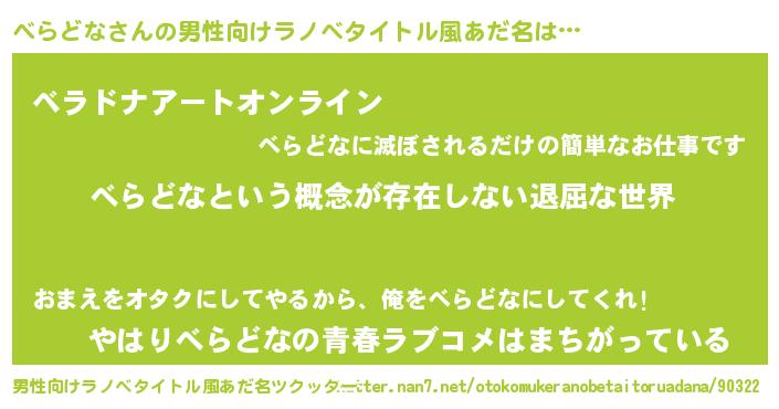 | 女子向けラノベタイトル風あだ名 | 『異世界で失敗しない100のべらどな』 |