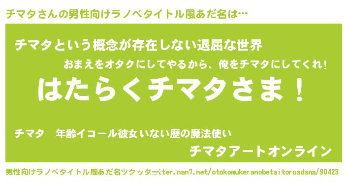 | 胡散臭い通販商品みたいなあだ名 | 『絶対に幸福をもたらす健康食品…その名も「チマタ」』 |