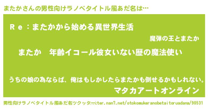 | 女子向けラノベタイトル風あだ名 | 『またかの玉の輿計画!』『闇のまたか』 |