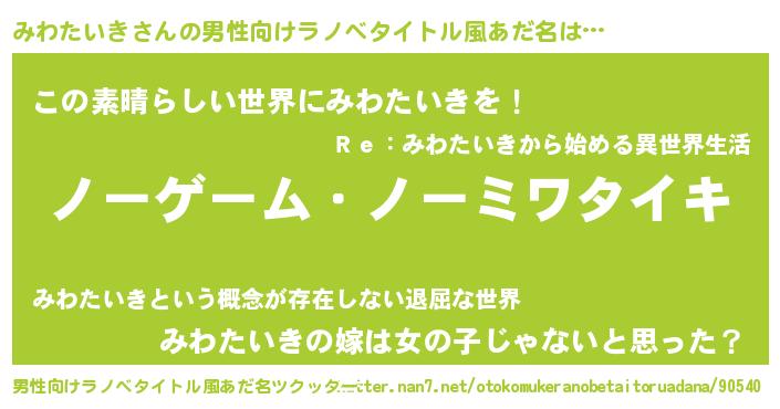 | 女子向けラノベタイトル風あだ名 | 『死神みわたいきの再婚』 |