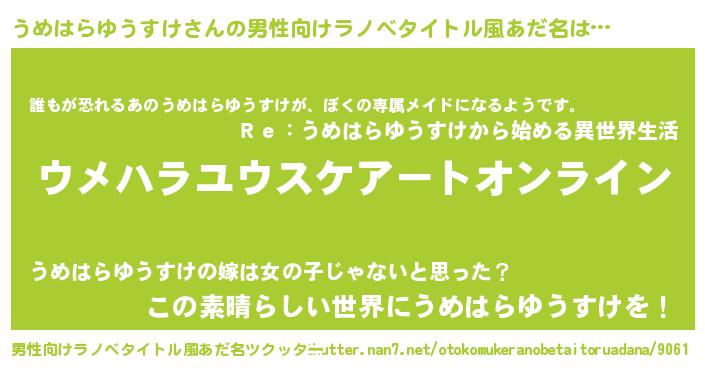 | 女子向けラノベタイトル風あだ名 | 『誰かこのうめはらゆうすけを説明してください! ~契約から始まるウェディング~』 |