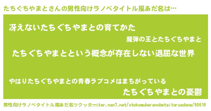 | 胡散臭い通販商品みたいなあだ名 | 『絶対に幸福をもたらす水素水…その名も「たちぐちやまと」』 |