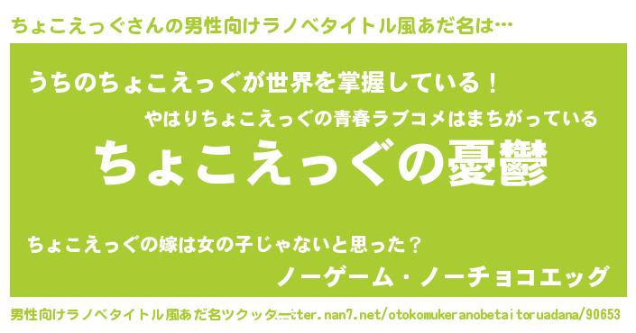 | 女子向けラノベタイトル風あだ名 | 『(仮)ちょこえっぐのやんごとなき事情』 |