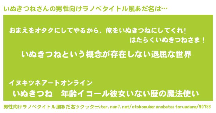 | 女子向けラノベタイトル風あだ名 | 『異世界で失敗しない100のいぬきつね』 |