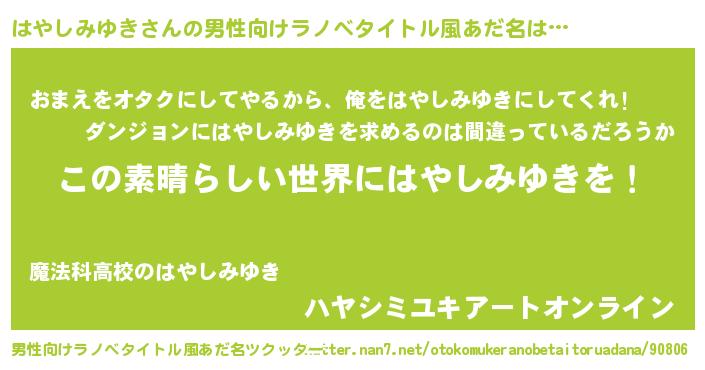 | 女子向けラノベタイトル風あだ名 | 『乙女ゲームの破滅フラグしかない悪役はやしみゆきに転生してしまった…』 |