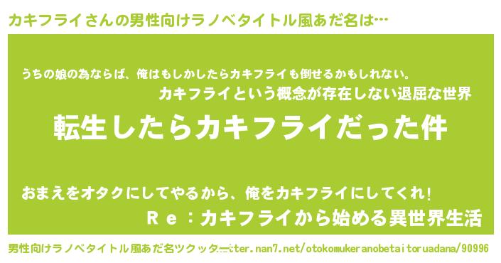 | 女子向けラノベタイトル風あだ名 | 『カキフライの玉の輿計画!』 |