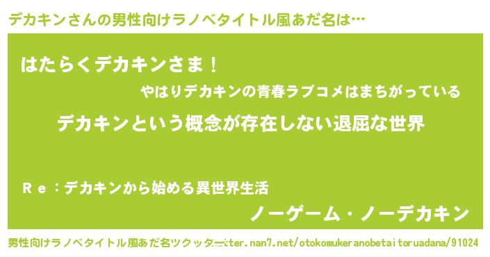 | 女子向けラノベタイトル風あだ名 | 『異世界で失敗しない100のデカキン』 |