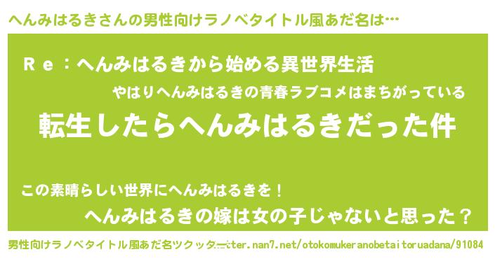 | 女子向けラノベタイトル風あだ名 | 『へんみはるきの玉の輿計画!』 |
