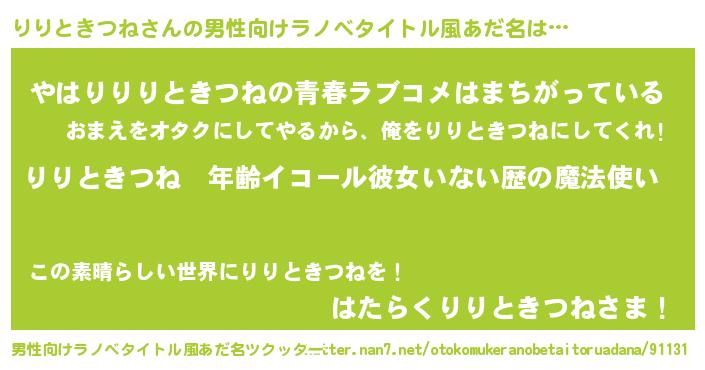 | 女子向けラノベタイトル風あだ名 | 『りりときつねの玉の輿計画!』 |