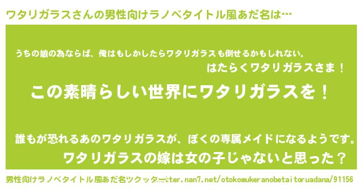 | 女子向けラノベタイトル風あだ名 | 『悪役ワタリガラスに転生したようですが、知った事ではありません』 |