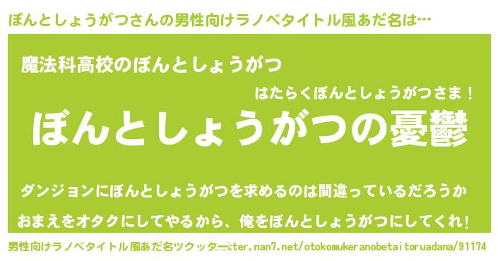| 女子向けラノベタイトル風あだ名 | 『ぼんとしょうがつ姫と円卓の騎士』 |