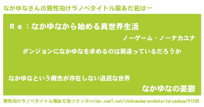| 女子向けラノベタイトル風あだ名 | 『なかゆなの卵を拾いまして』 |