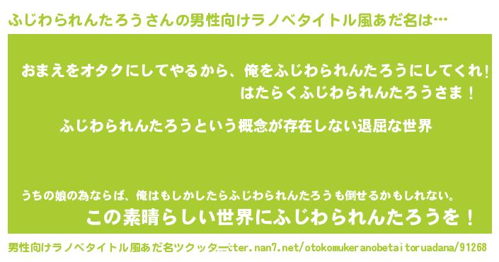 | 女子向けラノベタイトル風あだ名 | 『異世界で失敗しない100のふじわられんたろう』 |