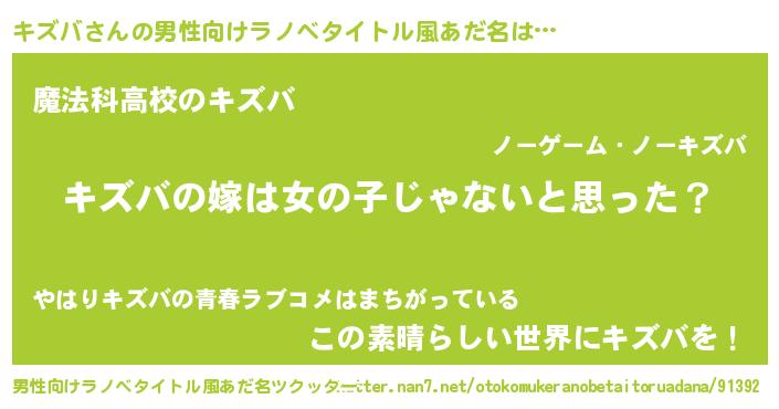| 女子向けラノベタイトル風あだ名 | 『キズバの卵を拾いまして』 |