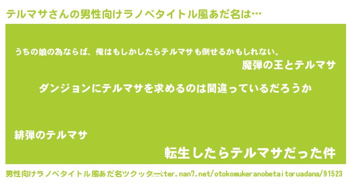 | 女子向けラノベタイトル風あだ名 | 『テルマサの卵を拾いまして』 |