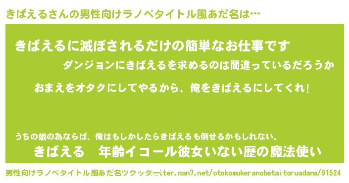 | 女子向けラノベタイトル風あだ名 | 『きばえる夫妻のなれそめ』 |