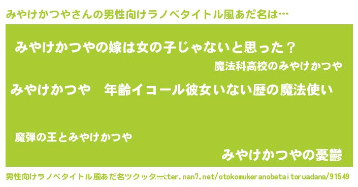 | 女子向けラノベタイトル風あだ名 | 『みやけかつやの玉の輿計画!』 |