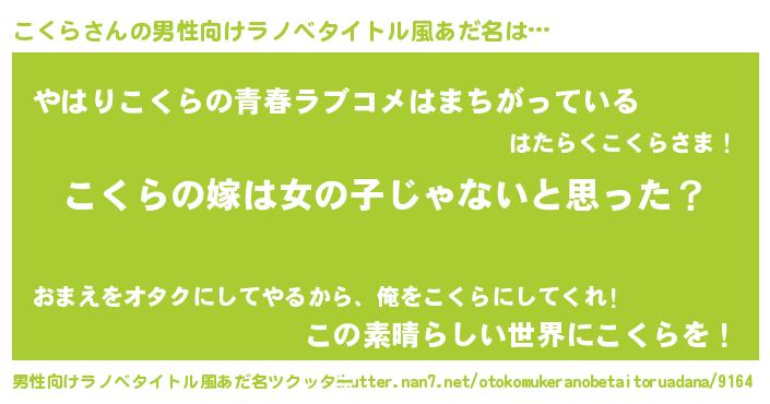 | 女子向けラノベタイトル風あだ名 | 『こくら様がみてる』『こくら伯爵の花嫁』 |