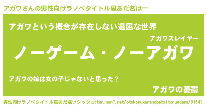 | 女子向けラノベタイトル風あだ名 | 『死神アガワの再婚』 |