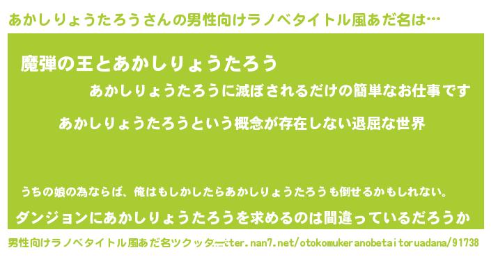 | 女子向けラノベタイトル風あだ名 | 『異世界で失敗しない100のあかしりょうたろう』 |