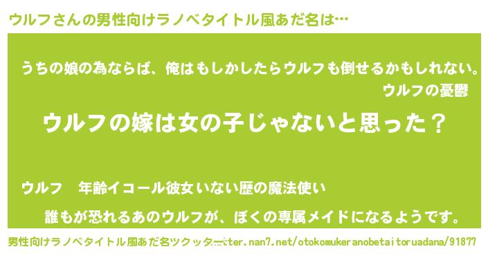| 女子向けラノベタイトル風あだ名 | 『ウルフ様がみてる』『ウルフの婚約者』 |