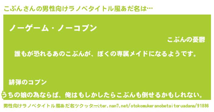 | 女子向けラノベタイトル風あだ名 | 『こぶんの契約王妃』『死神こぶんの再婚』 |