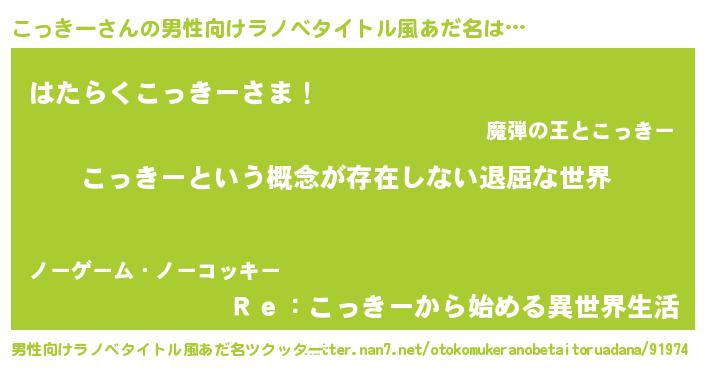 | 女子向けラノベタイトル風あだ名 | 『異世界で失敗しない100のこっきー』 |