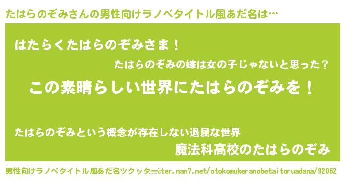 | 女子向けラノベタイトル風あだ名 | 『乙女ゲームの破滅フラグしかない悪役たはらのぞみに転生してしまった…』 |