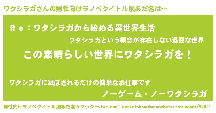 | 女子向けラノベタイトル風あだ名 | 『乙女ゲームの破滅フラグしかない悪役ワタシラガに転生してしまった…』 |