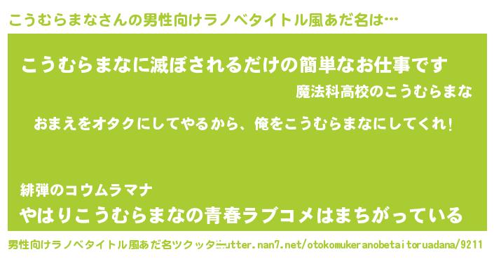 | 女子向けラノベタイトル風あだ名 | 『こうむらまな夫妻のなれそめ』 |