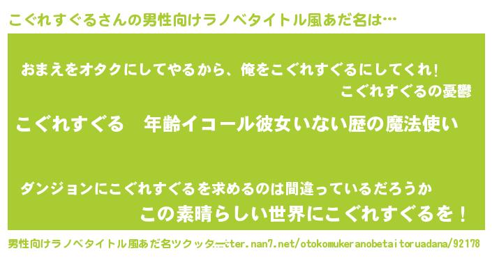 | 女子向けラノベタイトル風あだ名 | 『こぐれすぐるの玉の輿計画!』 |