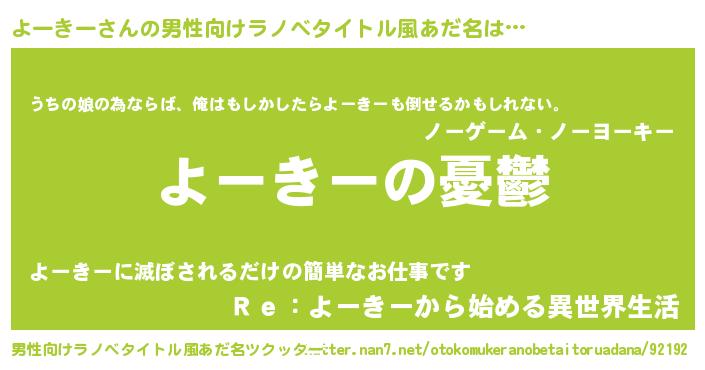 | 女子向けラノベタイトル風あだ名 | 『(仮)よーきーのやんごとなき事情』 |