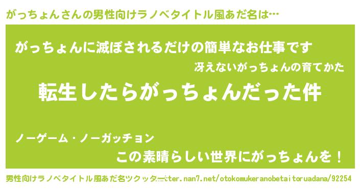 | 胡散臭い通販商品みたいなあだ名 | 『世界中を虜にした世界で10本だけ現存している希少なブランデー…その名も「がっちょん」』 |