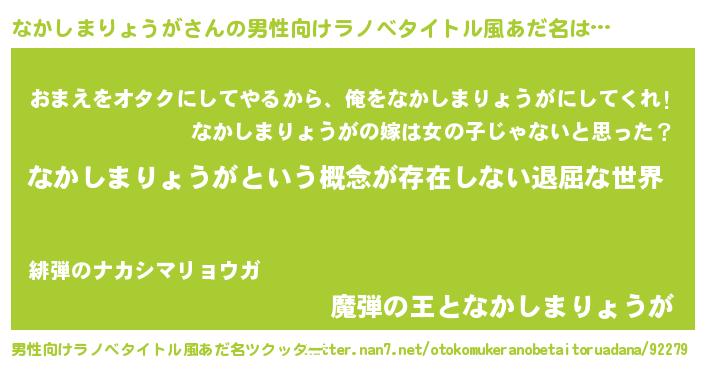 | 女子向けラノベタイトル風あだ名 | 『なかしまりょうがの契約王妃』 |