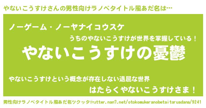 | 女子向けラノベタイトル風あだ名 | 『(仮)やないこうすけのやんごとなき事情』 |