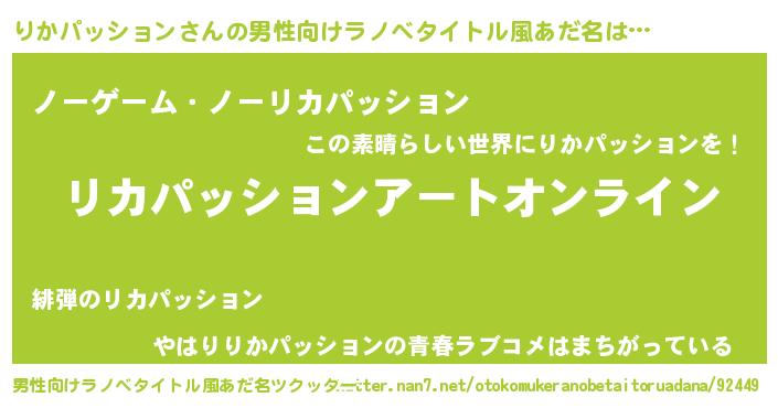 | 女子向けラノベタイトル風あだ名 | 『誰かこのりかパッションを説明してください! ~契約から始まるウェディング~』 |