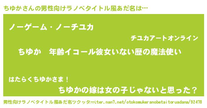 | 女子向けラノベタイトル風あだ名 | 『ちゆかの玉の輿計画!』 |
