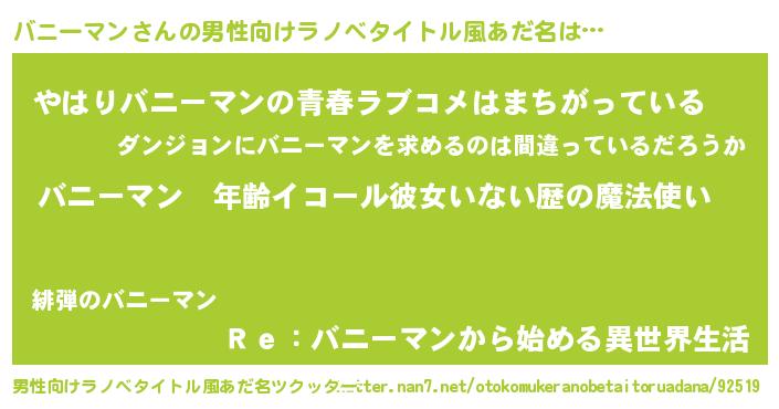 | 女子向けラノベタイトル風あだ名 | 『バニーマンの玉の輿計画!』 |