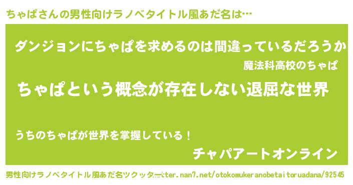 | 女子向けラノベタイトル風あだ名 | 『異世界で失敗しない100のちゃぱ』 |